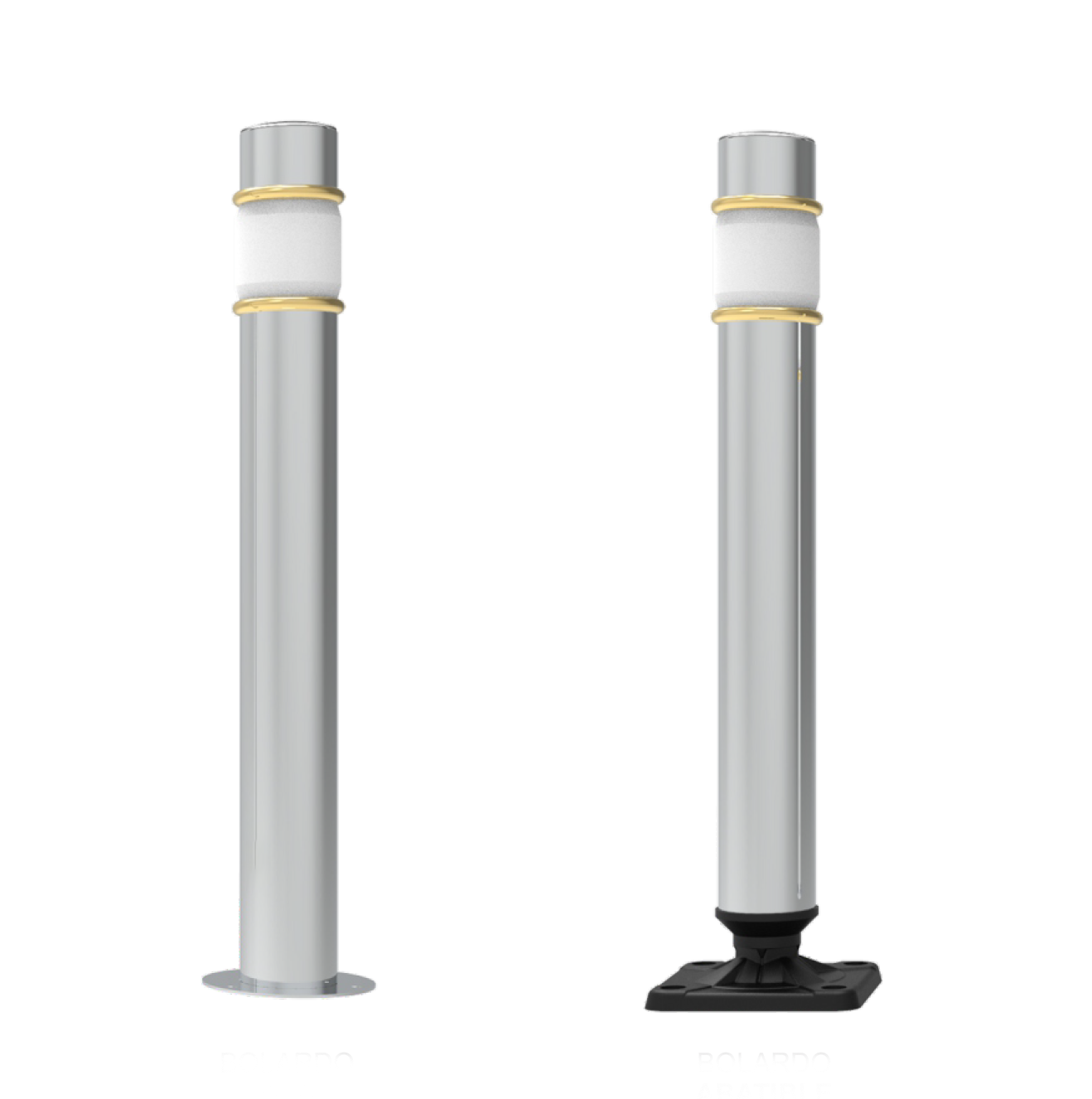 El diseño de los bolardos de acero se constituye por un cabezal luminoso de polietileno traslucido que es resguardado por un copete de acero inoxidable, además de contar con 2 anillos dorados que realzan su elegancia.
